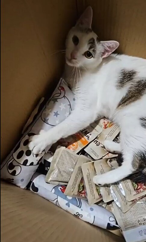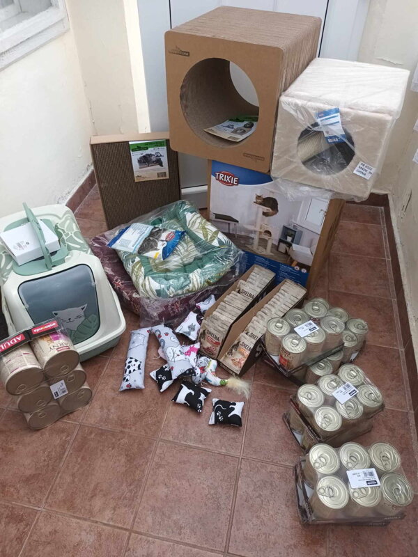 Dobrovolníčky zo združenia nakrúcali aj naživo veľký unboxing prvej várky - 3 balíky (video TU - https://www.facebook.com/100064864863983/videos/298414592624628 a TU https://www.facebook.com/100064864863983/videos/3354011291577172 ). Štvrtý balík sme kvôli dovolenke posielali o niečo neskôr, no už aj z neho sa mačiaci tešia. Viď fotky: