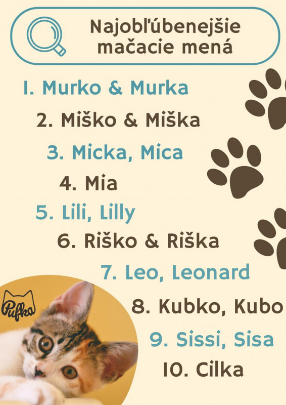 Po zaujímavostiach sa presuňme na top 10 mien, ktoré dávame našim mačičkám a kocúrikom. Na prvom mieste jednoznačne vedú Murka s Murkom, ktorí mali od ostatných mien dosť veľký odstup. Na druhej priečke je Miška a Miško. Treticu uzatvára mačičkovské meno Micka. Štvrtým najobľúbenejším menom je Mia. Piate miesto patrí Lilinkám a šieste ryšavcom Riškom a Riškám. Siedme a ôsme miesto prislúcha kocúrom Leom a Kubkom. Deviata je cisárovná Sissi a posledné, desiate miesto obsadili Cilky.